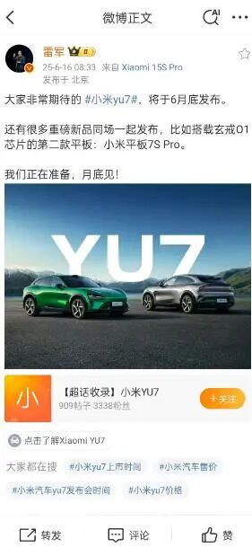 6月16日,小米创办人、董事长兼CEO雷军发布微博称,小米YU7,将于6月底发布。